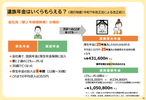 遺族厚生年金は、亡くなった夫の老齢厚生年金の報酬比例部分の3/4です。上図では、夫の厚生年金加入期間は8年間ですが、加入期間が25年に満たない場合には、25年加入したとみなされるので、遺族厚生年金額は43万1,600円となります。